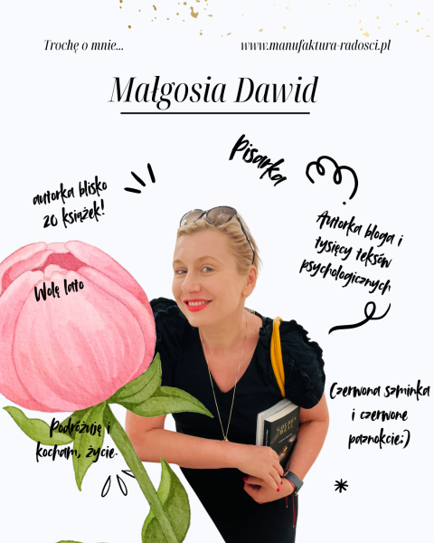 „Manufaktura radości” Małgosi Dawid jest to książka do której można ciągle sięgać i zawsze znajdzie się coś inspirującego. Jest to zbiór ciekawych budzących do życia wskazówek.