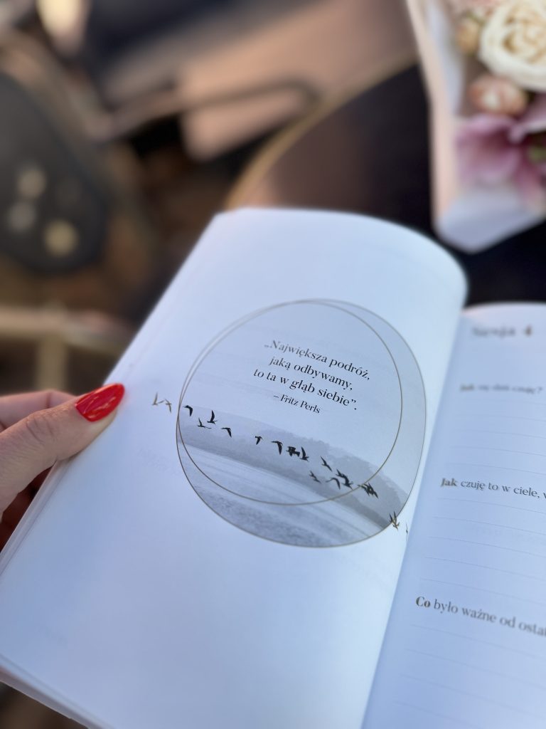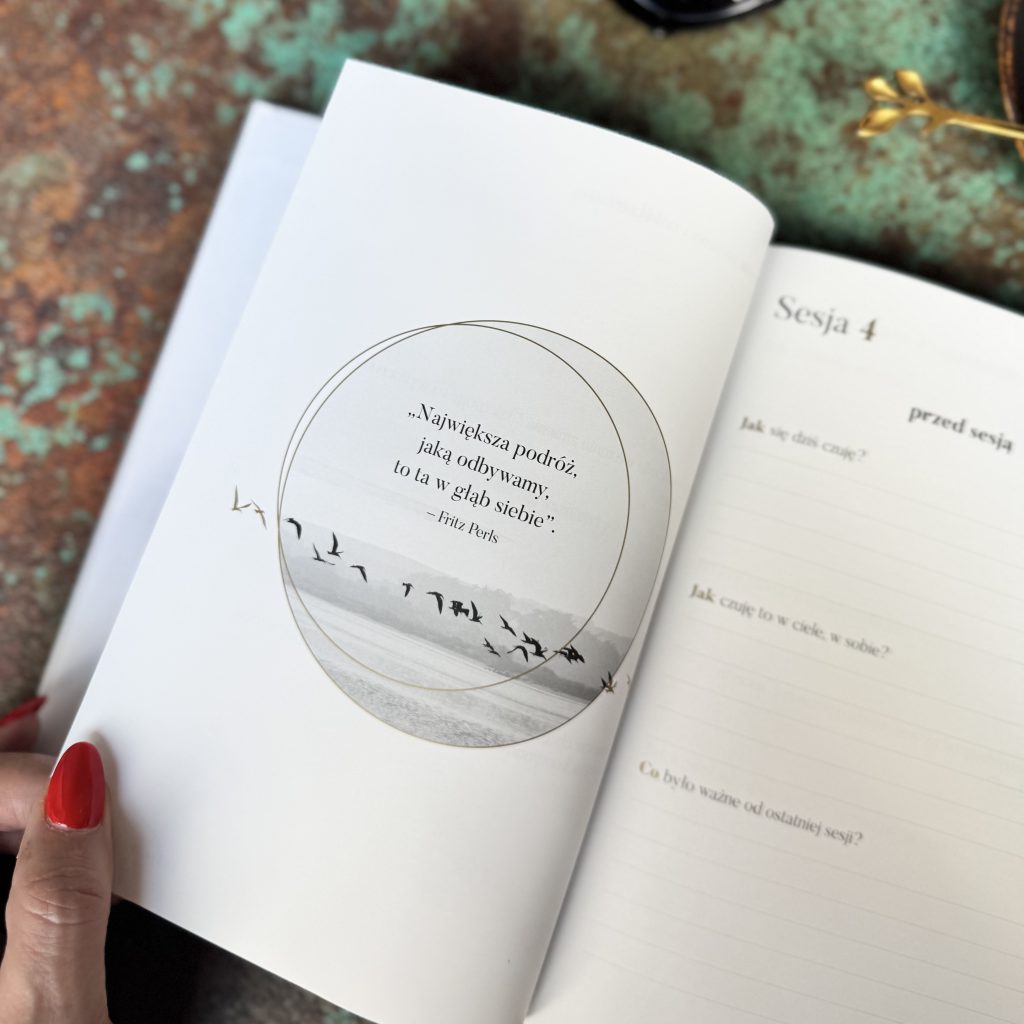 To nie jest pusty zeszyt. To narzędzie z przemyślaną strukturą, rotacyjnymi pytaniami, tekstami wsparcia i przestrzenią na zapis przed i po sesji. Jest jak rozmowa z mądrym przewodnikiem – ale na papierze.