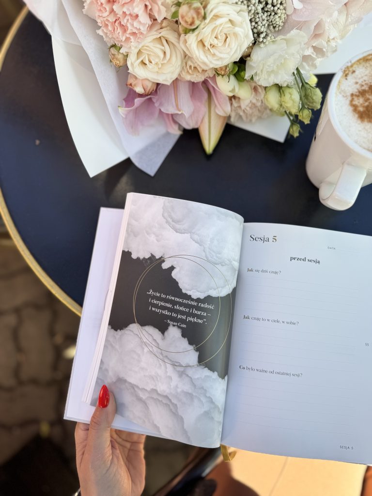 📓 200 stron w twardej oprawie, format A5 – z miejscem na 25 sesji terapeutycznych, tekstami wsparcia, pytaniami rotacyjnymi, przestrzenią na emocje, odkrycia i olśnienia.
