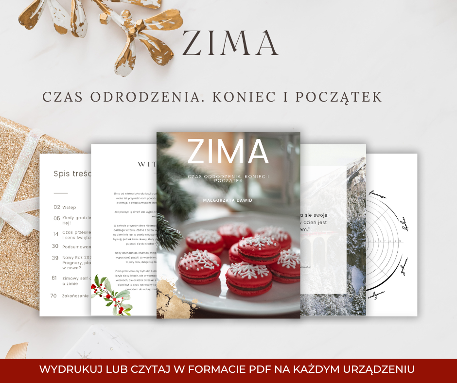 „Zima” to mój autorski e-book kończący cykl. „Zima” to zbiór tekstów na sezon od grudnia do lutego, dzięki którym lepiej przejdziesz przez sezon zimna, bardziej świadomie przeżyjesz święta, podsumujesz i otworzysz Nowy Rok!