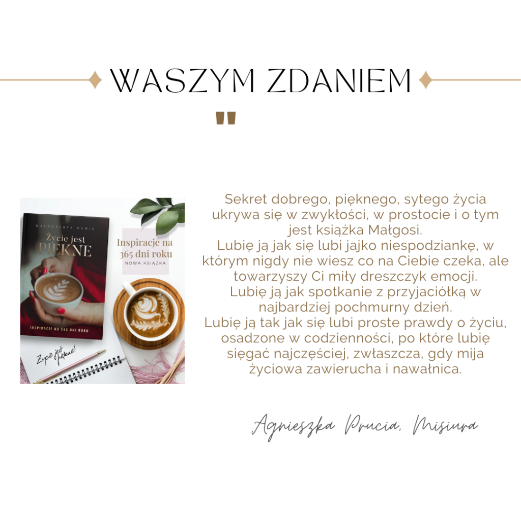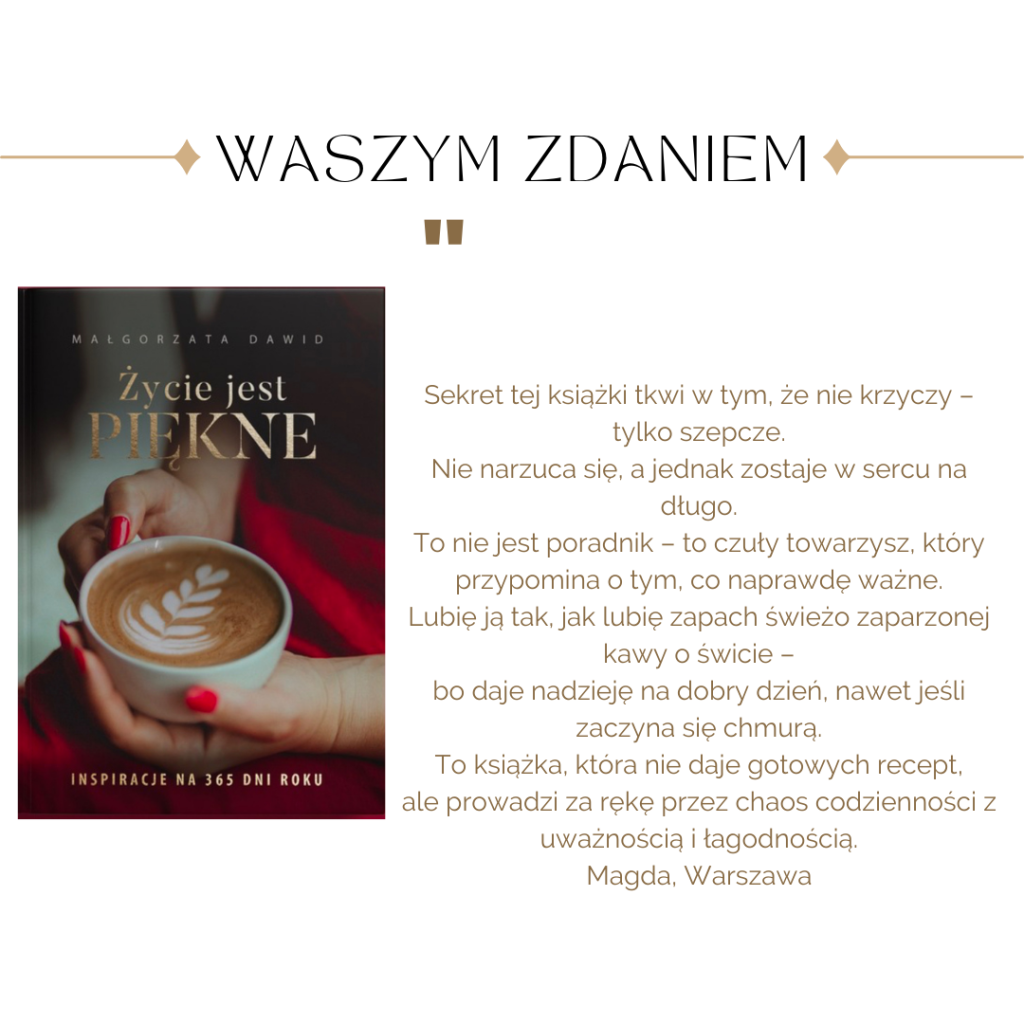 Życie jest piękne to 365 krótkich tekstów, które pomogą Ci zatrzymać się choć na chwilę i zobaczyć, że każdy dzień ma w sobie coś wyjątkowego.